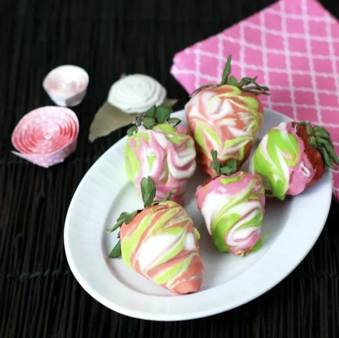 Step 4: Fully dip 1 strawberry into pink base, twisting and turning when lifting up to create a marbled pattern. Allow excess candy coating to drip off. Set strawberry on the prepared baking sheet. Drizzle more white and orange over pink base. Repeat with remaining strawberries.