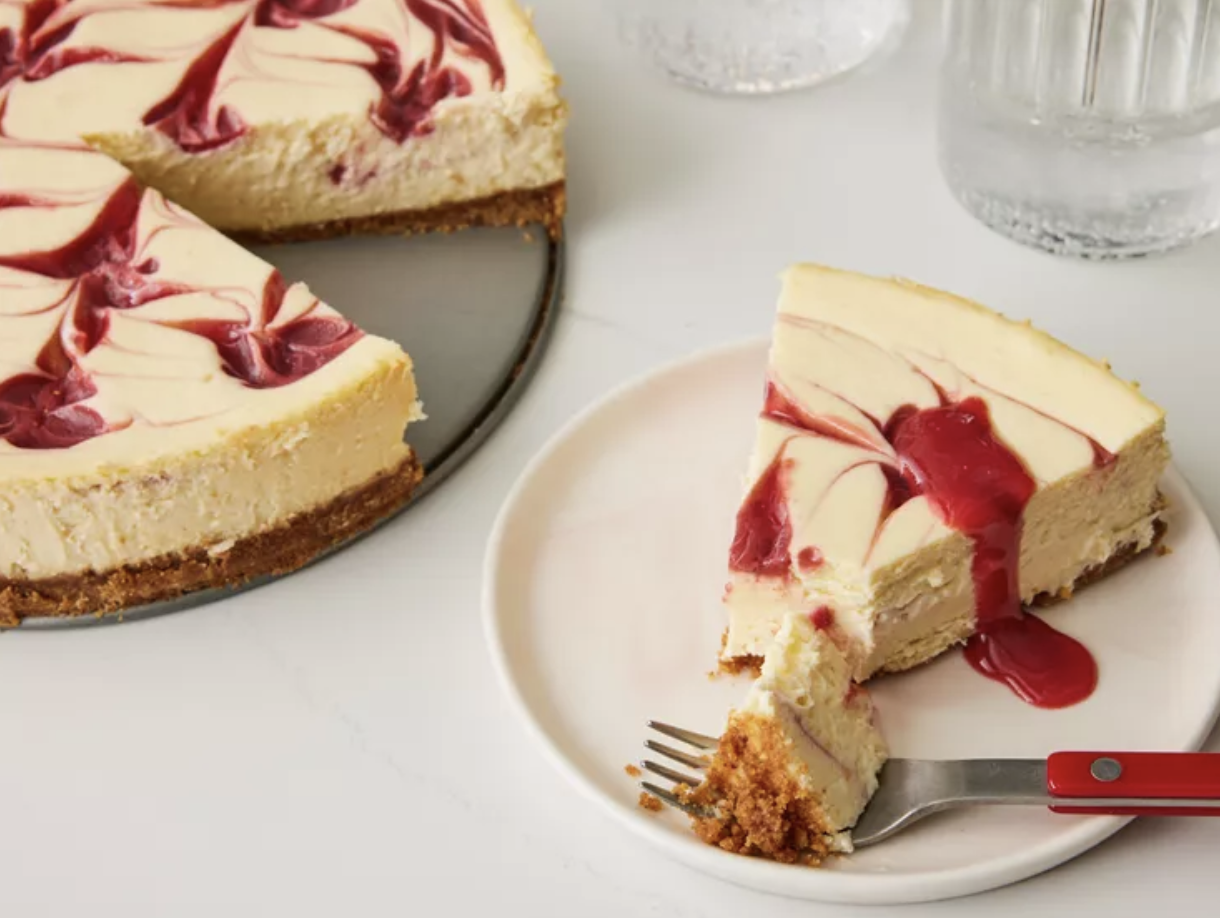 Step 7: Carefully spoon remaining cream cheese mixture over sauce; drop remaining strawberry sauce by 1/2 teaspoonfuls on top.